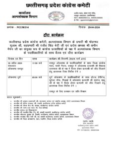 अल्पसंख्यक विभाग के पदाधिकारियों के साथ बैठक एवं दुर्ग लोकसभा दौरा कार्यक्रम रखा गया है । इस बैठक कार्यक्रम में रायपुर लोकसभा एवं दुर्ग लोकसभा के चुनाव में कांग्रेस के प्रत्याशियों के पक्ष में प्रचार करने व कड़ी महेनत करने दिशा निर्देश दिया जायेगा ।