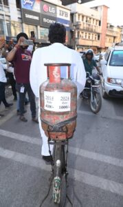 फर्स्ट टाइम वोटरों को पहले मतदान फिर बाकी काम का संदेश भी दिया और भारत की लोकतंत्र को मजबूत करने के लिए मतदान की अपील भी की। इस दौरान साइकिल में सिलेंडर रखकर चलाते हुए भी नजर आए सिलेंडर पर कांग्रेस की यूपीए सरकार में मिल रहे 450 रुपए के सिलेंडर की कीमत एवं भाजपा सरकार में मिल रहे हैं ₹1100 सिलेंडर की कीमत को दर्शाया गया।