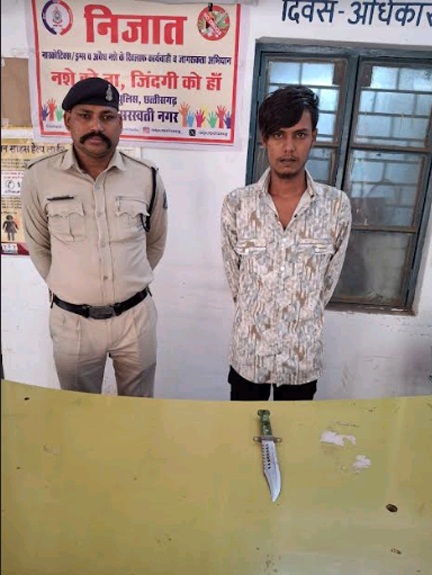 रायपुर।(सियासत दर्पण न्यूज़) थाना सरस्वती नगर पुलिस को सूचना मिली की कबीर चौक दंतेश्वरी मन्दिर मस्जिद रोड कोटा के पास एक व्यक्ति अपने हाथ में धादार चाकू लेकर आने जाने वाले लोगों को डरा धमका कर आतंकित करते हुये आरोपी प्रियांशु सिंग पिता जसबीर सिंह उम् 21 साल निवासी मस्जिद रोड कोटा रायपुर को गिरफ्तार कर उसके कब्जे से अवैध रूप से रखे 01 नग स्टील का धारदार चाकू जप्त कर आरोपी के विरुद्ध थाना सरस्वती नगर में अप. क्र.122/ 24 धारा 25,27 आर्म्स एक्ट का अपराध पंजीबद्ध कर कार्यवाही किया गया।