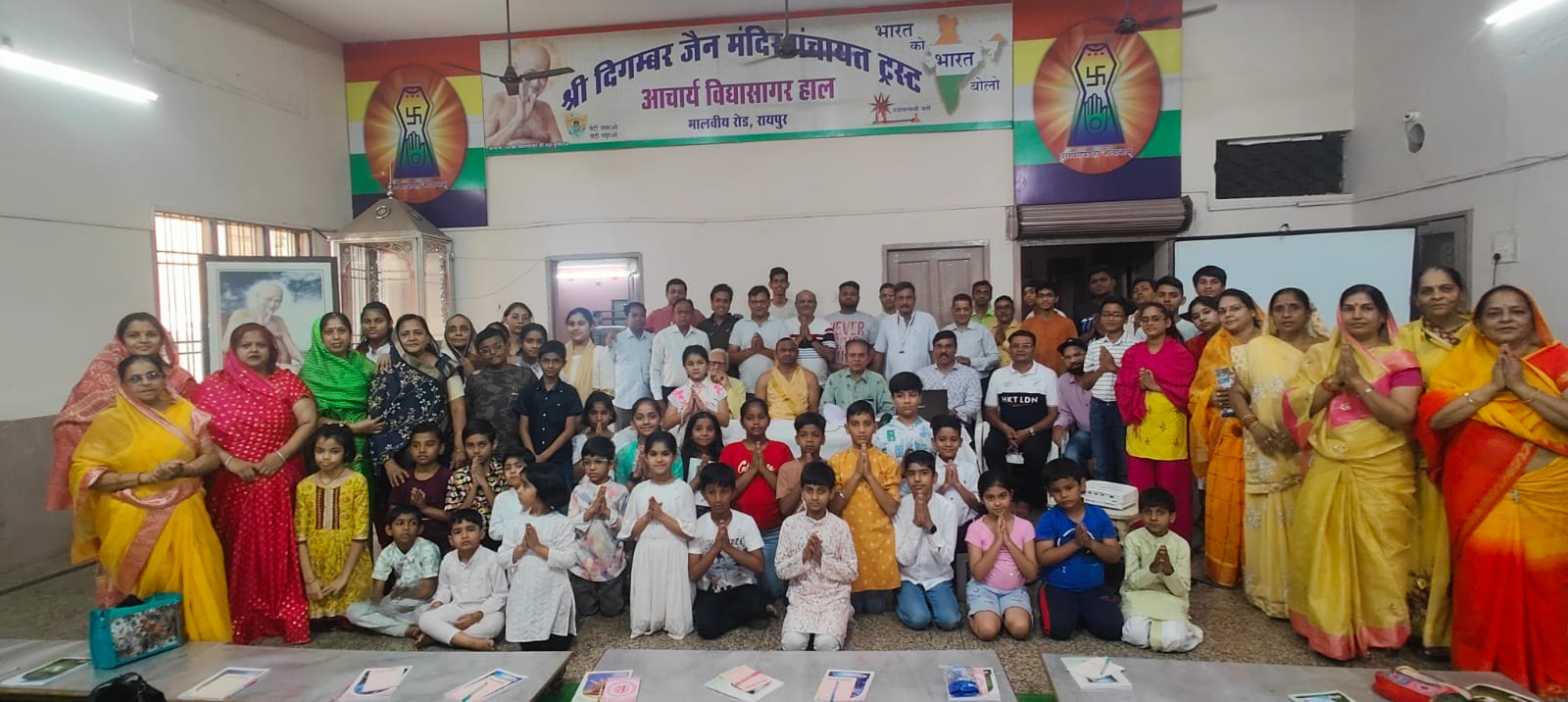 रायपुर, सियासत दर्पण न्यूज़,छत्तीसगढ़ की राजधानी रायपुर श्री दिगम्बर जैन मंदिर, मालवीय रोड बड़े मंदिरजी में विराजित मूलनायक श्री आदिनाथ भगवान के समक्ष लंबे अंतराल के बाद पंडित नितिन जी के सानिध्य में श्री आदिनाथ विद्या धार्मिक पाठशाला का शुभारम्भ मंगलाचरण से हुआ। समाज के सदस्यो एवं छोटे-छोटे बच्चो ने जैन विधि अनुसार आज अभिषेक, शांतिधारा व पूजन व भक्तामर विधान अमरचंद, यशवंत किशोर , महेंद्र ,प्रथम ,मेघा,जया जैन परिवार की तरफ़ किया गया जिसमे 40 श्रावको ने भगवान का अभिषेक पूजन पं संजय जैन के मार्गदर्शन में किया, तत्पश्चात विद्यासागर हॉल में बाल बोध धार्मिक संस्कारों का बीजारोपण हेतू नई डिजिटल तकनीक के द्वारा प्रोजेक्टर में जैन धर्म का कर्तव्य, भेद एवं गुणों पर आधारित वीडियो के चित्रण को 45 बच्चो ने देख कर धर्म के मूल को समझा ।