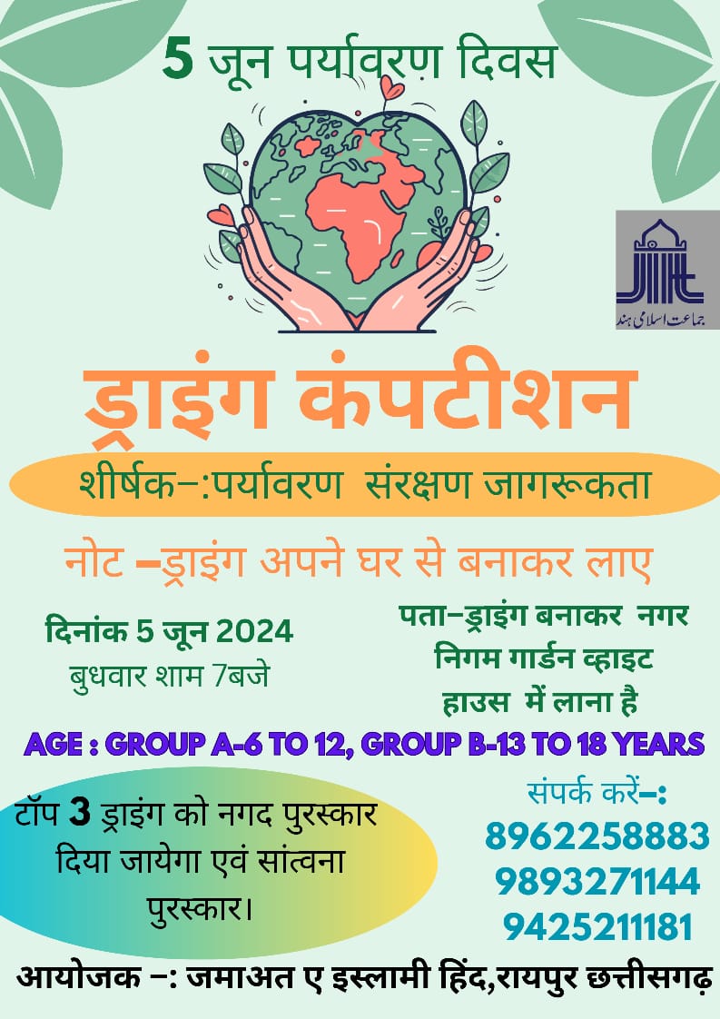 रायपुर,सियासत दर्पण न्यूज़,जमाअत ए इस्लाम हिंद,रायपुर के द्वारा पर्यावरण जागरूकता अभियान के तहत 5 जून 2024 को विश्व पर्यावरण दिवस के दिन ड्राइंग कंपटीशन रखा गया है जिसका का शीर्षक “पर्यावरण संरक्षण जागरूकता” है जिसको दो वर्गों में बांटा गया है ग्रुप ए 6 से 12 साल और ग्रुप भी 13 से 18 साल तक। ड्राइंग प्रतियोगिता में भाग लेने वाले प्रतिभागियों को टॉप 3 ड्राइंग को नगद पुरस्कार एवम भाग लेने वालो को सांत्वना पुरस्कार दिया जाएगा।