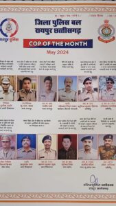 रायपुर,सियासत दर्पण न्यूज़, वरिष्ठ पुलिस अधीक्षक रायपुर संतोष सिंह द्वारा पुलिसिंग के क्षेत्र में अच्छा कार्य कर रहे अधिकारी कर्मचारी को प्रोत्साहित करने हेतु प्रति माह “कॉप ऑफ द मंथ’’ पुरस्कार देने की शुरुआत की गई है वरिष्ठ पुलिस अधीक्षक रायपुर द्वारा कॉप ऑफ द मंथ सम्मान से रायपुर पुलिस लाइन के रक्षित निरीक्षक वैभव मिश्रा को लगन व जिम्मेदारी से कार्य करने और बेहतर बल प्रबंधन के लिए; निरीक्षक दुर्गेश रावटे थाना प्रभारी टिकरापारा निजात के तहत नशे के विरुद्ध जागरूकता