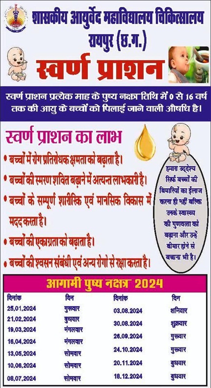 रायपुर। (सियासत दर्पण न्यूज़) रोग प्रतिरोधक क्षमता बढ़ाने 3 अगस्त को रायपुर के शासकीय आयुर्वेद महाविद्यालय चिकित्सालय में बच्चों को स्वर्णप्राशन कराया जाएगा। आयुर्वेद महाविद्यालय चिकित्सालय में हर पुष्य नक्षत्र तिथि में शून्य से 16 वर्ष के बच्चों को स्वर्णप्राशन कराया जाता है। चिकित्सालय के कौमारभृत्य बाल रोग विभाग में सवेरे नौ बजे से दोपहर दो बजे तक इसका सेवन कराया जाता है। यह औषधि बच्चों की रोग प्रतिरोधक क्षमता बढ़ाने, श्वसन संबंधी एवं अन्य रोगों से रक्षा करने के साथ ही एकाग्रता और स्मरण शक्ति बढ़ाने में अत्यंत लाभकारी है। यह बच्चों के शारीरिक और मानसिक विकास में भी मदद करता है। शासकीय आयुर्वेद महाविद्यालय चिकित्सालय में हर पुष्य नक्षत्र तिथि में बच्चों के लिए स्वर्णप्राशन का आयोजन किया जाता है। स्वर्णप्राशन हर महीने की पुष्य नक्षत्र तिथि में शून्य से 16 वर्ष के बच्चों को पिलाई जाने वाली औषधि है। इस साल 3 अगस्त के साथ ही अन्य पुष्य नक्षत्र तिथियों 30 अगस्त, 26 सितम्बर, 24 अक्टूबर, 20 नवम्बर और 18 दिसम्बर को भी स्वर्णप्राशन कराया जाएगा।
