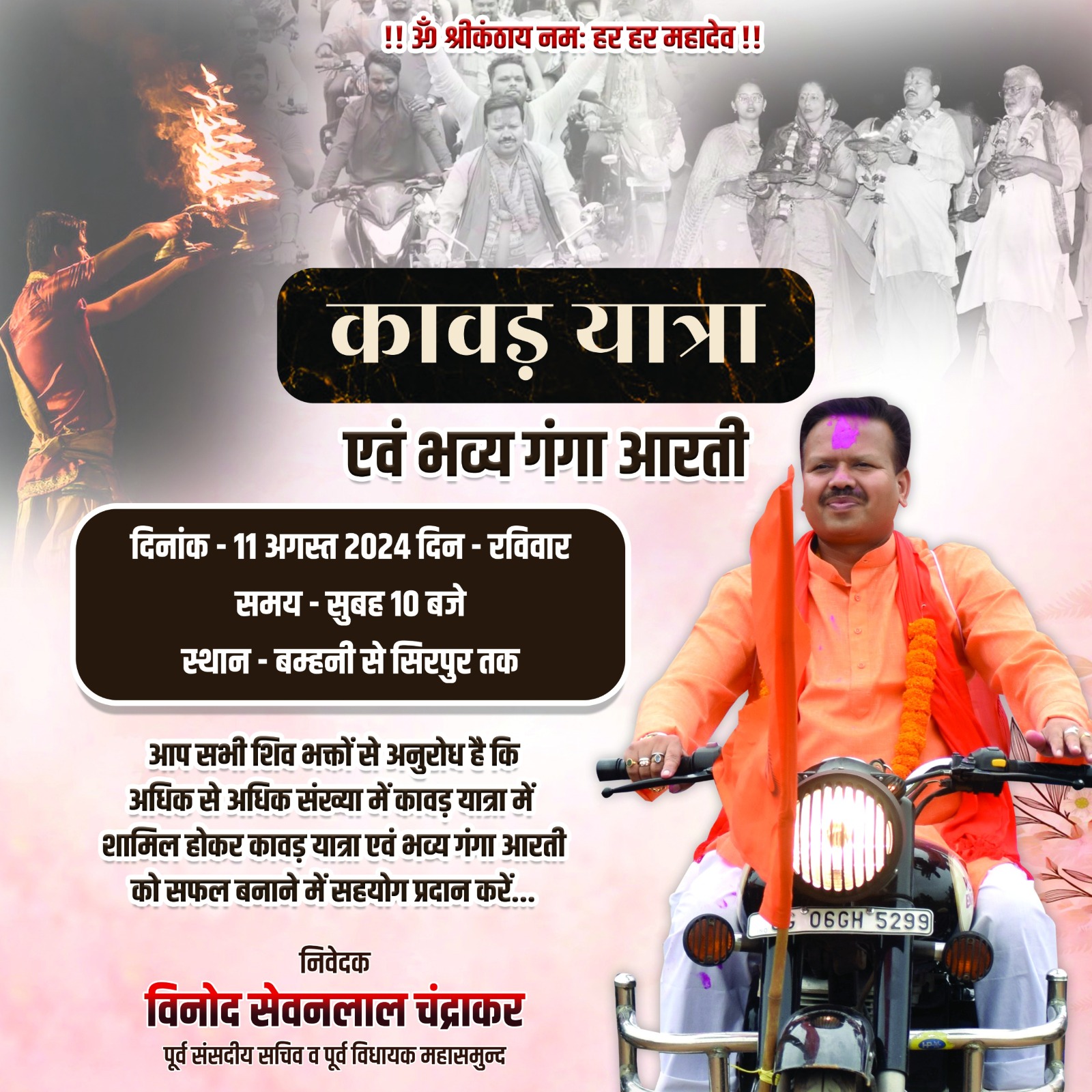 सिरपुर,सियासत दर्पण न्यूज़,11अगस्त 2024 को सुबह 10 बजे बम्हनी बम्हनेश्वरनाथ से जल लेकर सिरपुर गंधेश्वरनाथ महादेव में जलाभिषेक किया जाएगा। संध्याकाल को सिरपुर में भव्य महा गंगा आरती का आयोजन सम्पन्न होगा। शिवजलाभिषेक व भव्य महागंगा आरती कार्यक्रम में शामिल होकर श्रद्धालुजन पुण्य लाभ लें.