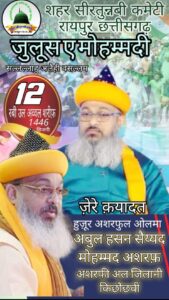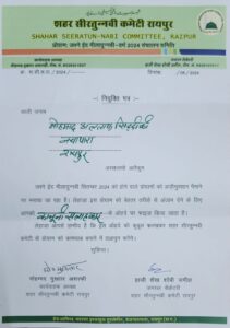 ज्ञात हो की सितंबर माह में 12 रबीउल अव्वल शरीफ है जिसमें रायपुर में ऐतिहासिक जुलूसे मोहम्मदी निकलता है जिसे लगभग 101 साल हो जाएंगे,आज़ादी से पहले 1922 या 23 में पहली बार जुलूस निकला था। सदर मोहम्मद मुख्तार अशरफी ने इसे बखूबी अंजाम देने के लिए अपनी टीम में एडव्होकेट मोहम्मद अल्ताफ सिद्दीकी को (लीगल एडवाइजर) कानूनी सलाहकार नियुक्त किया है।