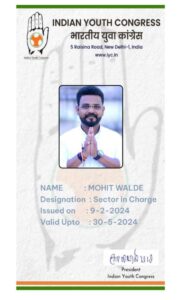 मोहित वालदे आम जनताओ से परचित जुडाव रहा है, कोरोना काल महामारी के चलते मोहित ने अपनी सेवा अपने स्वास्थ की ना फिक्र तक करते हुए आम जनताओ के हित अपनी सेवा प्रदान की एवं युवा काँग्रेस के प्रति निष्ठावान कार्य करते हुए उन्हे दुर्ग शहर जिला काँग्रेस सेक्टर प्रभारी बनाया गया है मोहित वालदे ने युवा काँग्रेस के राष्ट्रीय अध्यक्ष श्री बी. वी श्रीनिवासजी, प्रदेश अध्यक्ष आकाश शर्मा,प्रदेश महासचिव संदीप वोरा, एवं सभी वरिष्ठजनो का आभार व्यक्त किया!