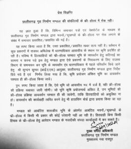 रायपुर, सियासत दर्पण न्यूज़,यह ज्ञात हुआ है कि,विभिन्न समाचार पत्रों एवं वेबपोर्टल के माध्यम से छत्तीसगढ़ गृह निर्माण मण्डल द्वारा भवनों/भूखण्डों के फ्री-होल्ड पर रोक लगाने के संबंध में समाचार प्रकाशित/प्रसारित की गई है।