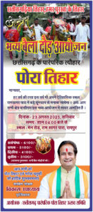 रायपुर,,सियासत दर्पण न्यूज़,, (छत्तीसगढ़)। पूर्व विधायक विकास उपाध्याय ने छत्तीसगढ़वासियों को पोरा तिहार एवं गणेश चतुर्थी की अग्रिम शुभकामनाएँ दी है और कहा कि प्रतिवर्ष अनुसार इस वर्ष भी दिनांक 23 अगस्त 2025 दिन शनिवार समय शाम 4ः00 बजे से रायपुर के ऐतिहासिक स्थल रामसागर पारा, मेन रोड, रायपुर (छ.ग.) में छत्तीसगढ़ी पुरखा के तिहार, पारंपरिक त्यौहार ‘‘पोला पर्व’’ का भव्य आयोजन होने जा रहा है। उपाध्याय ने कहा कि रामसागर पारा क्षेत्र में पुरानी परंपरा सदियों से चली आ रही है और यहाँ लगातार पूरे क्षेत्रवासियों के द्वारा बहुत ही उमंग एवं हर्षोउल्लास के साथ छत्तीसगढ़ के पारंपरिक त्यौहारों का आयोजन किया जाता है।