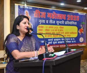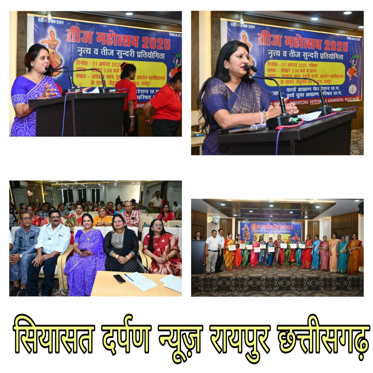 रायपुर,सियासत दर्पण न्यूज़,,वर्ल्ड ब्राह्मण फेडरेशन छ.ग. एवं सर्व युवा ब्राह्मण परिषद छ.ग. द्वारा विगत वर्षों की भाँति प्रदेश की विप्र महिलाओं, युवतियों को पूर्णतः सांस्कृतिक मंच प्रदान करने “तीज महोत्सव” का आयोजन अग्रवाल भवन, पुरानी बस्ती में किया गया. प्रतिभागियों ने समूह, एकल नृत्य, तीज सुंदरी की प्रस्तुति दी. कार्यक्रम की मुख्य अतिथि महापौर श्रीमती मीनल चौबे एवं विशेष अतिथि राज्य बाल संरक्षण आयोग अध्यक्ष श्रीमती वर्णिका शर्मा रहीं. अतिथियों ने माँ सरस्वती के चित्र पर माल्यार्पण, दीप प्रज्जवलन, वंदना कर कार्यक्रम का शुभारम्भ किया. पदाधिकारियों द्वारा अतिथियों का पुष्प गुच्छ एवं स्मृति चिन्ह प्रदाय कर स्वागत किया गया.