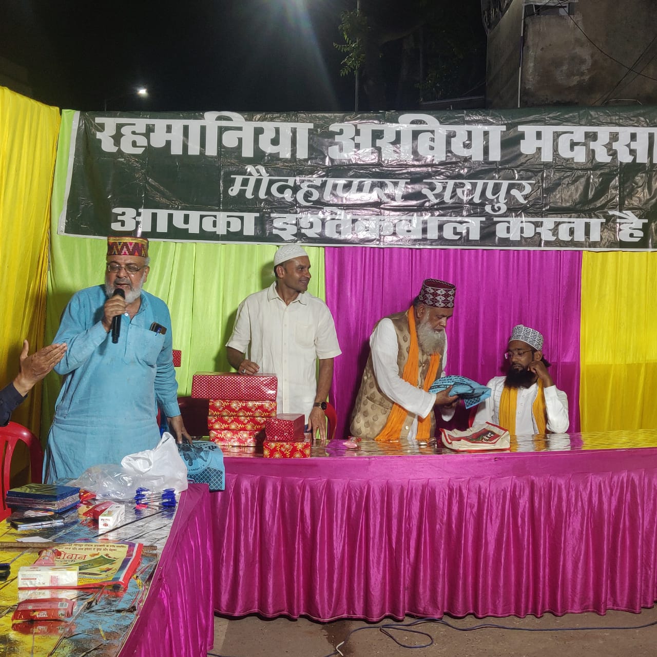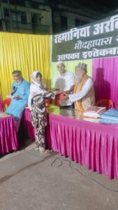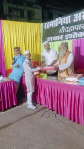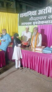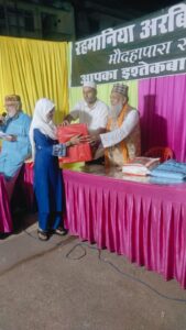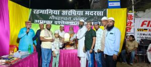 साथ ही साथ मदरसा के स्टाफ को भी तोहफा देकर सम्मानित किया गया,माइक संचालन सेक्रेटरी मोहम्मद आरिफ एडवोकेट और आभार व शुक्रिया रहमानिया अरबिया मदरसा के सदर (अध्यक्ष ) हाजी अब्दुल हमीद,ने किया,नातिया प्रोग्राम के निर्णायक(जज) हाजी रमज़ान अख्तर और इस्माइल नवाब खान,रहे,विशेष,सहयोग,अब्दुल मशीद, शाहबाज़, मोहम्मद नुरुल अशरफी,नाज़िर, कबीर,कासिफ थे
