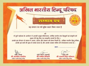 बिलासपुर।सियासत दर्पण न्यूज़,अखिल भारतीय हिन्दू परिषद बिलासपुर द्वारा आयोजित विशेष कार्यक्रम में शहर व जिले की विभिन्न समितियों को सम्मान पत्र प्रदान कर सम्मानित किया गया। यह आयोजन पूर्णतः गरिमामयी माहौल में सम्पन्न हुआ, जहां परिषद के पदाधिकारियों एवं सदस्यों ने संगठन की मजबूती और समाज सेवा की दिशा में आगे बढ़ने का संकल्प लिया।