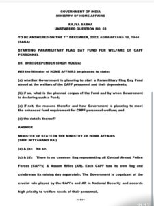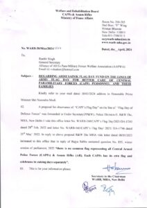 अब सवाल उठता है कि आए दिन शहीद हुए जवानों के आश्रित परिवार कहां जाएं। विधवाएं जिनके चांद नक्सलवाद आतंकवाद की भेंट चढ़ गए उनके बच्चों की शिक्षा स्वास्थ्य शादी पढ़ाई व पुनर्वास का जिम्मा कौन संस्था उठाए। एसोसिएशन अध्यक्ष पूर्व एडीजी श्री एचआर सिंह के नेतृत्व में माननीय तब के केंद्रीय गृह सचिव आरके भल्ला से अर्धसैनिक झंडा दिवस कोष व अन्य सुविधाओं को लेकर 2 फरवरी 2021 को नॉर्थ ब्लॉक कार्यालय में मुलाकात हुई थी और उन्होंने माना कि केंद्रीय अर्धसैनिक बलों के लिए इस प्रकार के कोष का गठन होना चाहिए। सभी फोर्सेस डीजी से राय भी मांगी गई लेकिन माननीय गृह राज्यमंत्री के संसद में दिए गए बयान से सब कुछ मटियामेट हो गया।