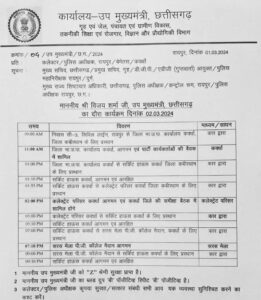 उपमुख्यमंत्री श्री शर्मा 02 मार्च को प्रातः 9 बजे रायपुर से कवर्धा के लिए प्रस्थान करेंगे। उपमुख्यमंत्री श्री शर्मा 11 बजे कार्यालय आयोजित बैठक में शामिल होंगे। 01 बजे कार्यालय से सर्किट हाउस के लिए प्रस्थान करेंगे।