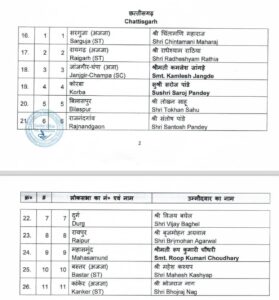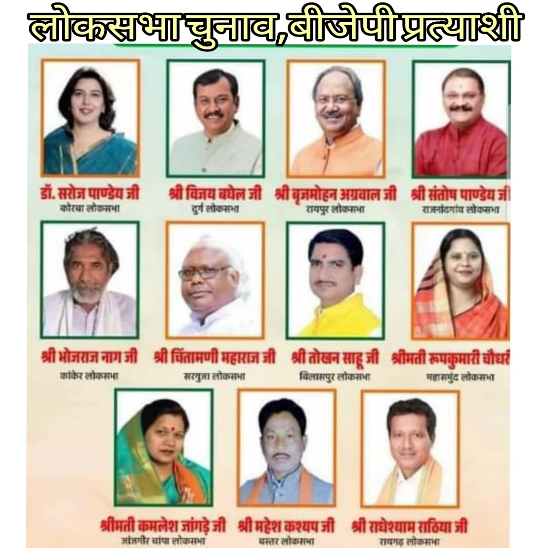 रायपुर । (सियासत दर्पण न्यूज़) भारतीय जनता पार्टी ने लोकसभा चुनाव के लिए प्रत्याशियों की पहली सूची जारी कर दी। पहली लिस्ट में पार्टी ने 195 से ज्यादा सीटों पर नामों की घोषणा की है। इसमें छत्तीसगढ़ की ग्यारह सीटों के लिए उम्मीदवारों का नाम भी शामिल है। दुर्ग से विजय बघेल, राजनांदगांव से संतोष पांडेय, रायपुर से बृजमोहन अग्रवाल, महासमुंद से रुपकुमारी चौधरी, कांकेर से भोजराज नाग चुनाव लड़ेंगे। वहीं कोरबा से सरोज पांडेय, सरगुजा से चिंतामणि महाराज, जांजगीर चांपा से कमलेश जांगड़े, रायगढ़ से राधेश्याम राठिया, बिलासपुर से तोखन साहू, बस्तर से महेश कश्यप को प्रत्याशी बनाया गया है।