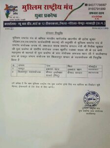 (आर.एस.एस,राष्ट्रोय कार्यकारिणी सदस्य) की अनुमति से मुस्लिम राष्ट्रीय मंच के राष्ट्रीय संयोजक जनाब मो. अफजाल ने राष्ट्रोय संगठन मंत्री गिरीश जूयाल,युवा प्रकोष्ठ के राष्ट्रीय संयोजक खुशोद रजाका की सहमती से युवा प्रकोष्ठ के प्रांत संयोजक अफजल खान ने छत्तीसगढ़ राज्य के सभी संभाग संयोजकों एवं सहसंयोजकों को नियुक्त किया है।इसी कड़ी में